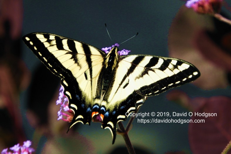 My photo above shows a beautiful example of the Western Tiger Swallowtail butterfly. This one spent a while in our front garden one afternoon earlier this week. These are very large butterflies; the wingspan of this one was about four inches.